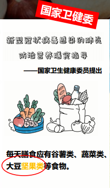 科学合理的营养膳食能有效改善营养状况、增强抵抗力,有助于新型冠状病毒感染的肺炎防控与救治。近日国家卫生健康委员会发布的《新型冠状病毒感染的肺炎防治营养膳食指导》,提出建议每日应适量吃些坚果,均衡营养,有助提升免疫力。人民日报微博中也在近期发布的7种营养素提高免疫力中提及,维生素E是体内的抗氧化剂,同时可提高抗感染能力,主要来源为坚果和谷类等。